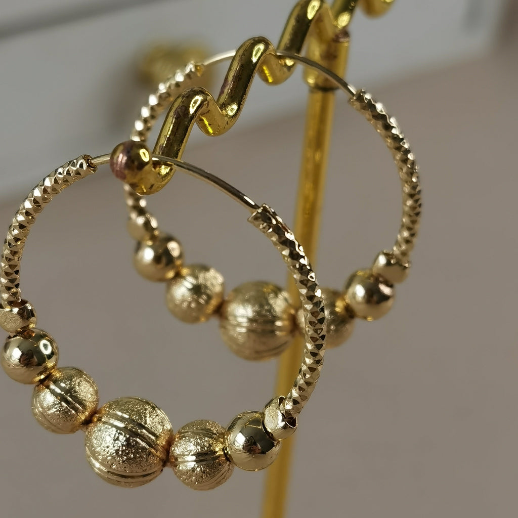Estos aretes combinan la elegancia de los aros con el detalle sofisticado de cuentas simétricamente distribuidas. Su estructura equilibrada crea una armonía visual que realza cualquier rostro, mientras que el patrón de cuentas añade textura y movimiento. Perfectos para quienes buscan un accesorio que sea tanto versátil como distintivo, estos aretes funcionan en cualquier contexto. El diseño simétrico transmite orden y refinamiento, convirtiéndolos en la opción ideal para completar tu look con estilo y confianza.