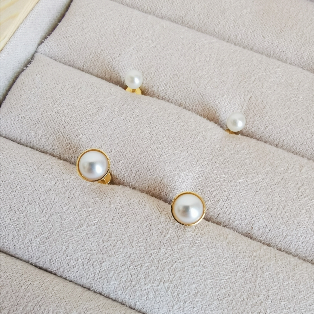 Con enchape de oro de 18k en tono dorado, perla color blanco. Un Diámetro aprox. 0.60 cm. Con broche tipo poste.