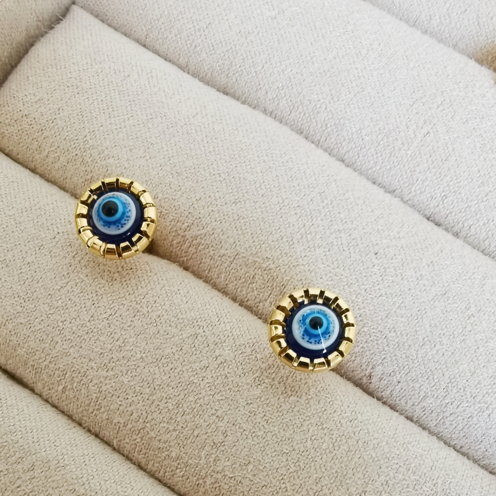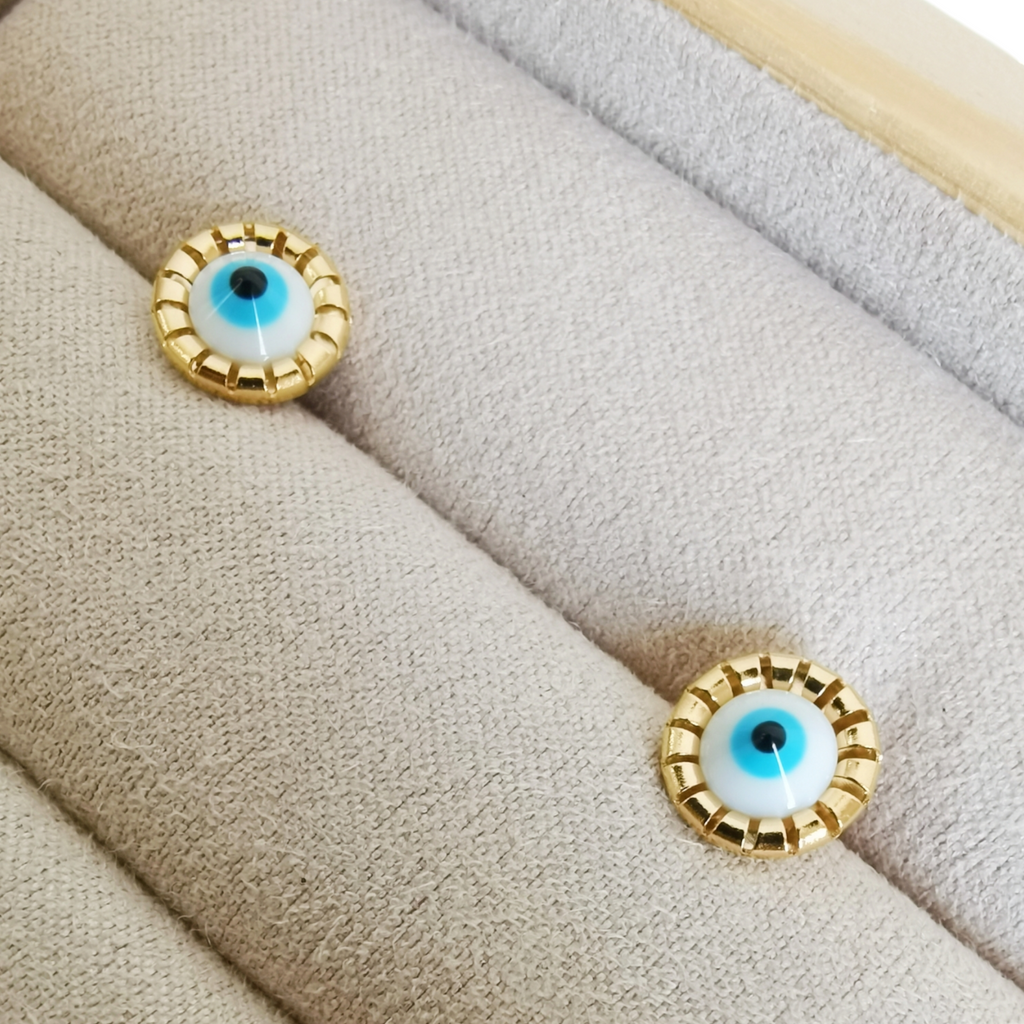 Con enchape de oro de 18k en tono dorado y ojo turco incrustado. Un Diámetro aprox. 0.80 cm. Con broche tipo tuerca.