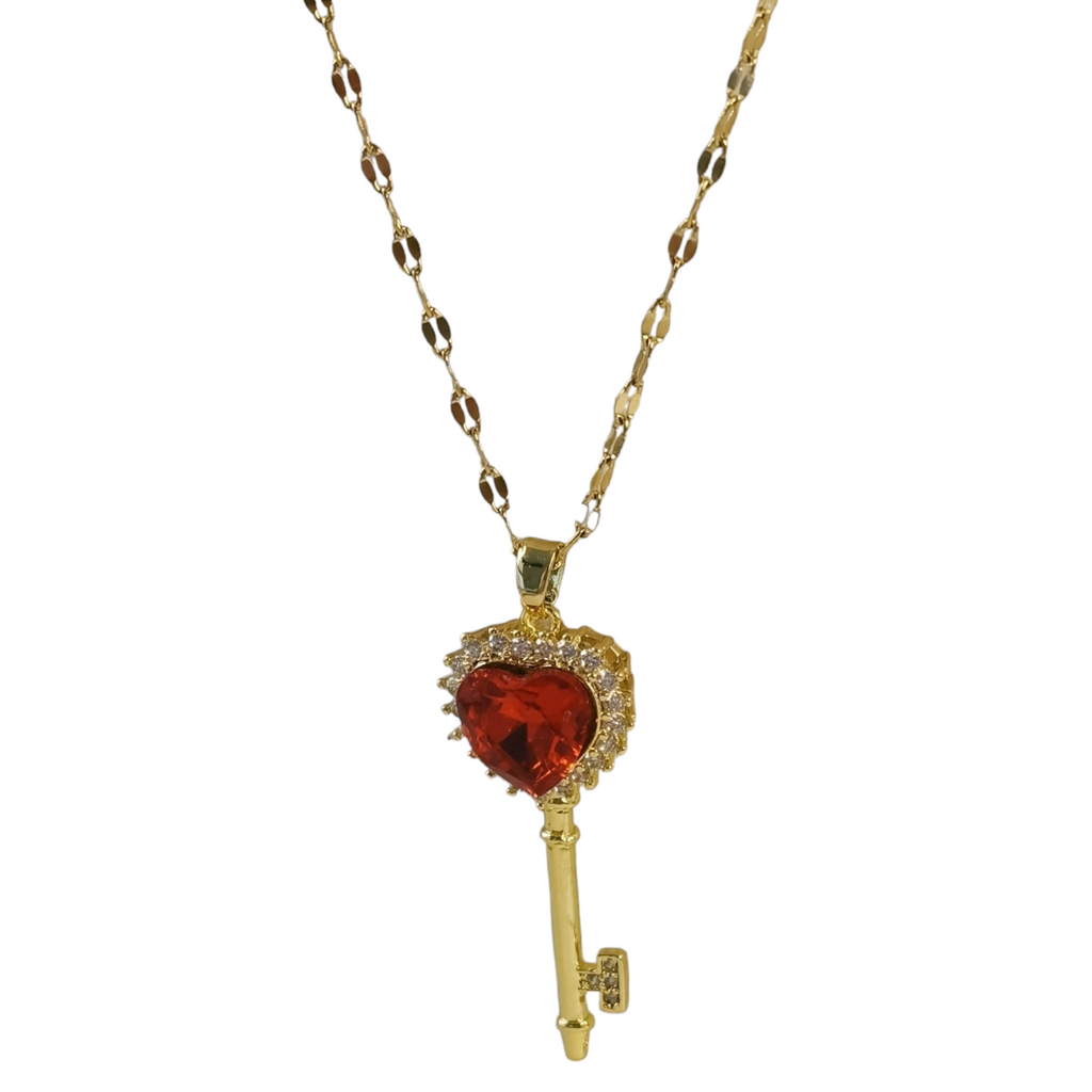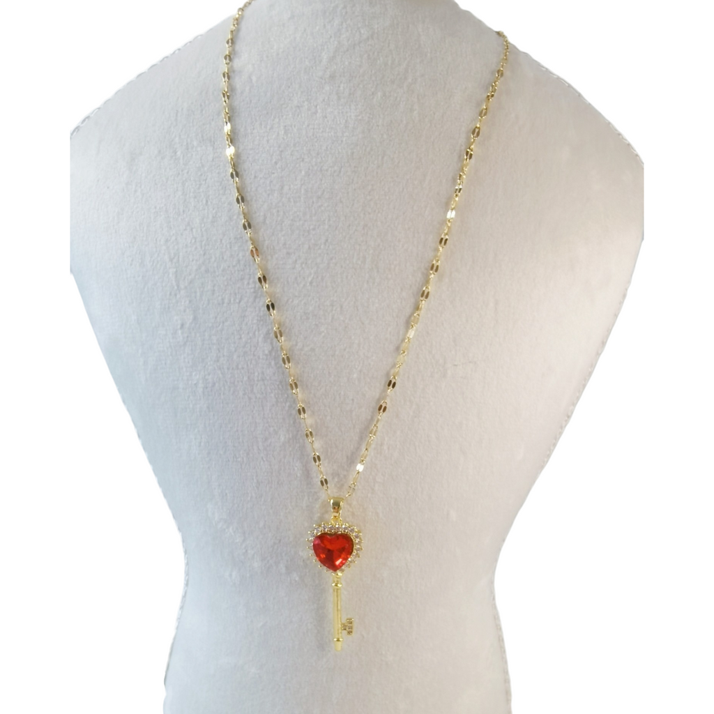Collar con enchape de oro 18k en tono dorado brillante con finos cristales, dije de llave y corazón rojo. Collar (largo aprox. 40.00 cm, con dije miden 4.50 cm. cadena de extensión 5.0 cm).