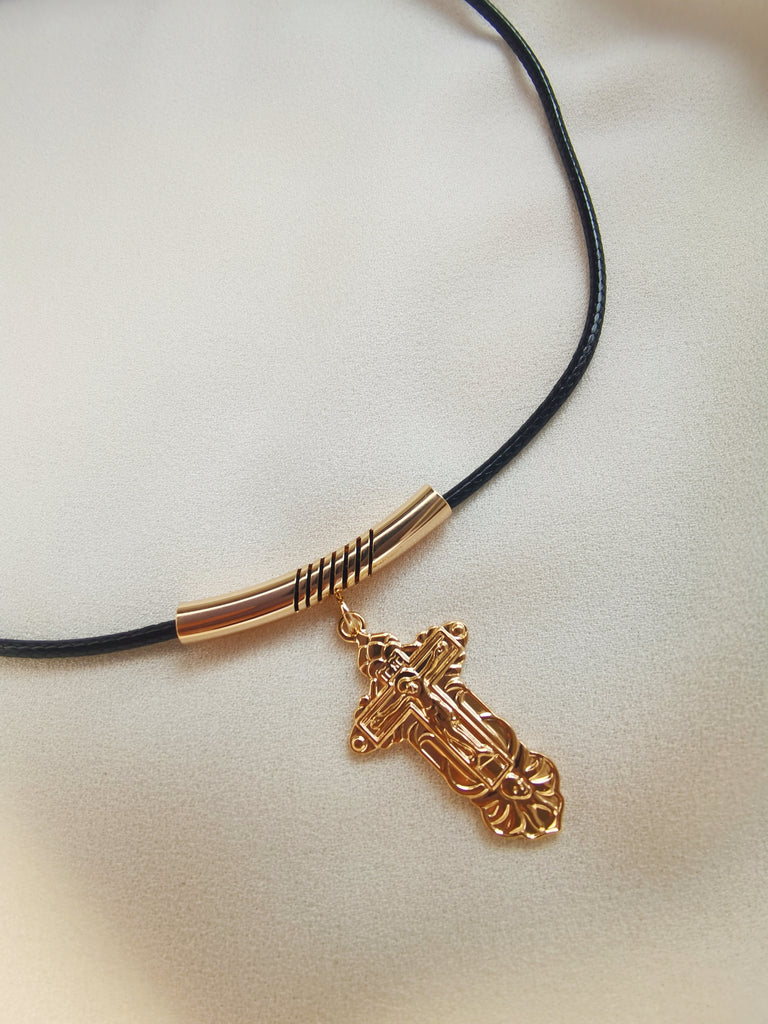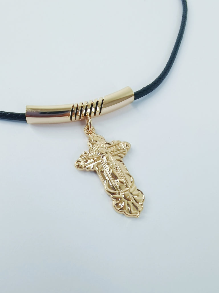 Choker con enchape de oro de 18k en tono dorado brillante . Collar material cordoncillo negro de pita encerada cuyo largo aprox. 40cm, +largo de la cadena de extensión 5 cm).y dije colgante de cristo de 3cm de largo.