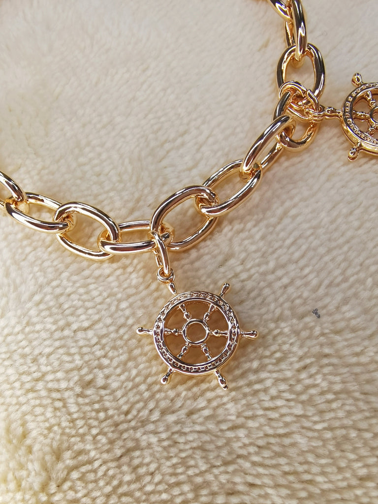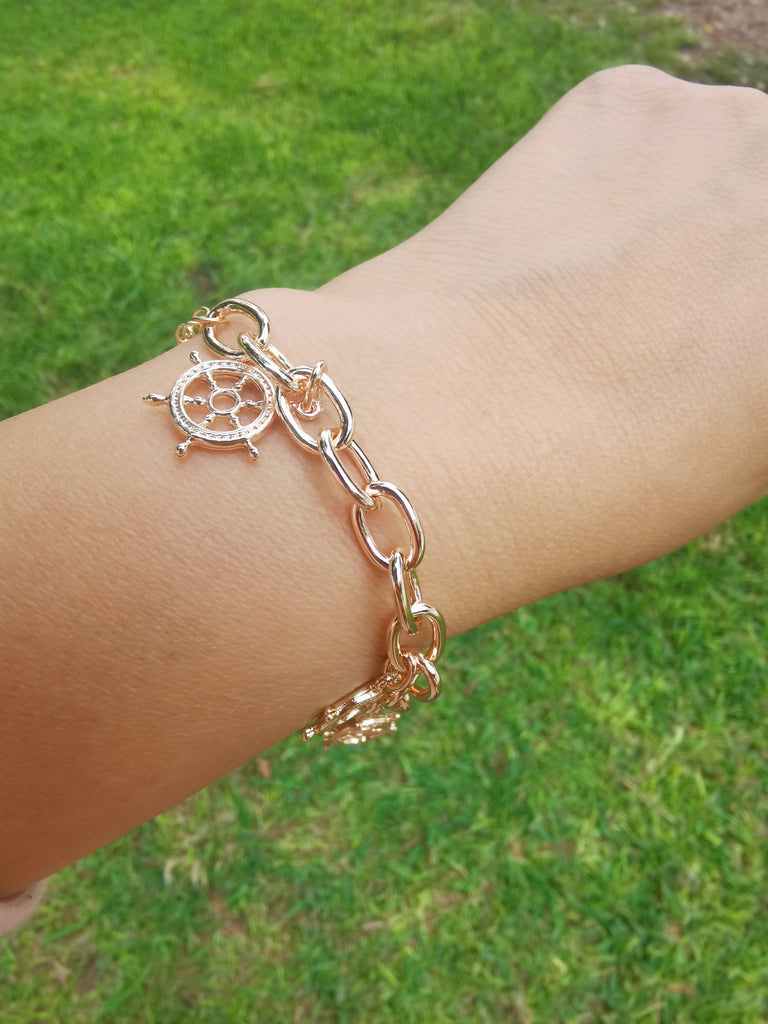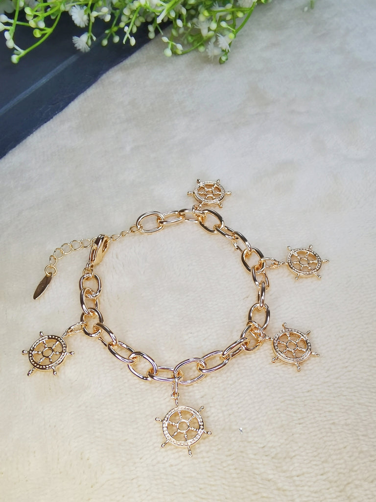 Pulsera delicada con cinco dijes de acero 316L con Enchape de oro en tono dorado rose brillante . Largo aprox. 19 cm. con cadena de estensión de 4 cm.