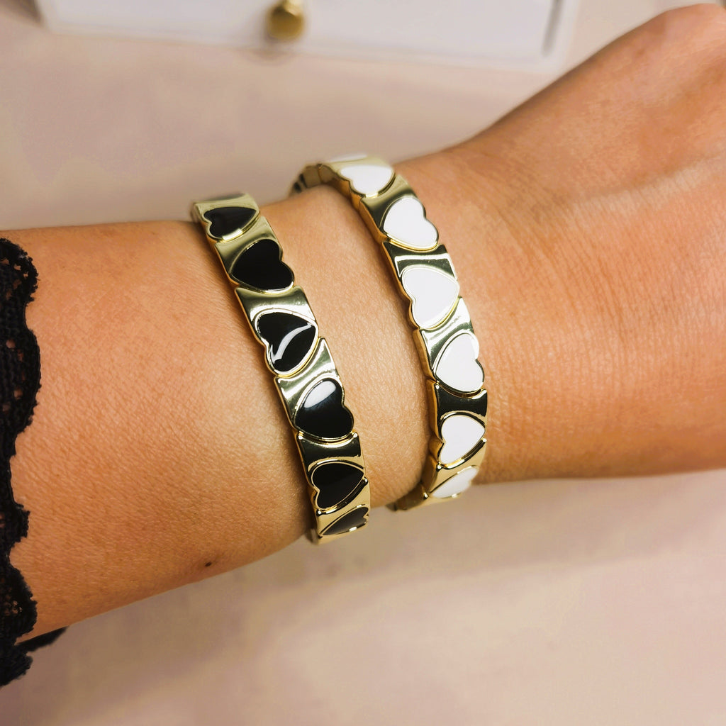 Descubre la elegancia de la Pulsera Itamar, diseñada para mujeres que buscan un accesorio único. Sus eslabones en forma de corazón combinan los tonos blanco y negro, realzados con un baño de oro 18k sobre acero inoxidable, garantizando durabilidad y estilo. Perfecta para complementar cualquier outfit y destacar tu personalidad con un toque sofisticado y moderno.